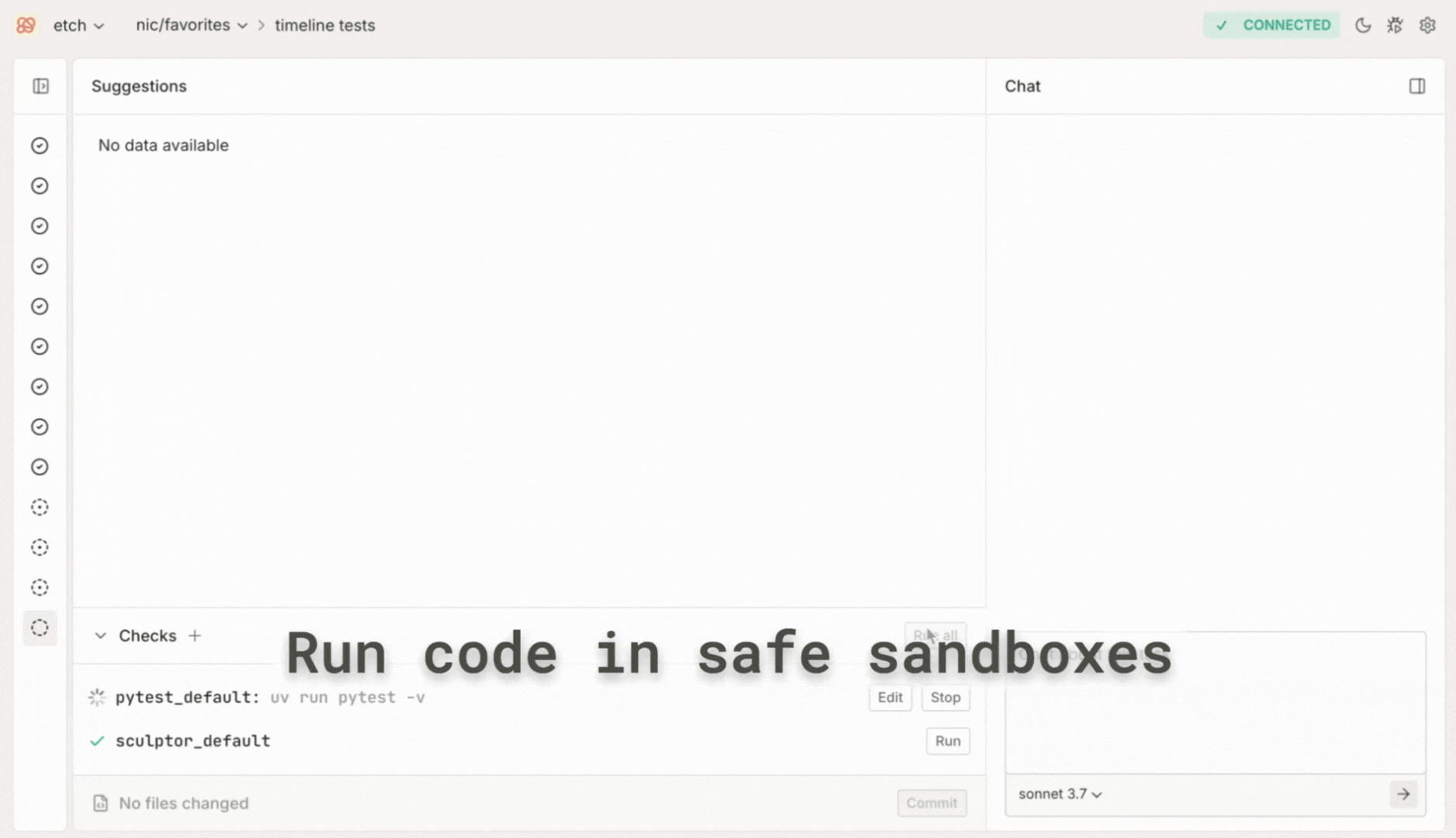 Sculptor runs your code in a sandbox, letting you test code safely, solve issues in parallel, and assign tasks to agents, working alongside any editor.