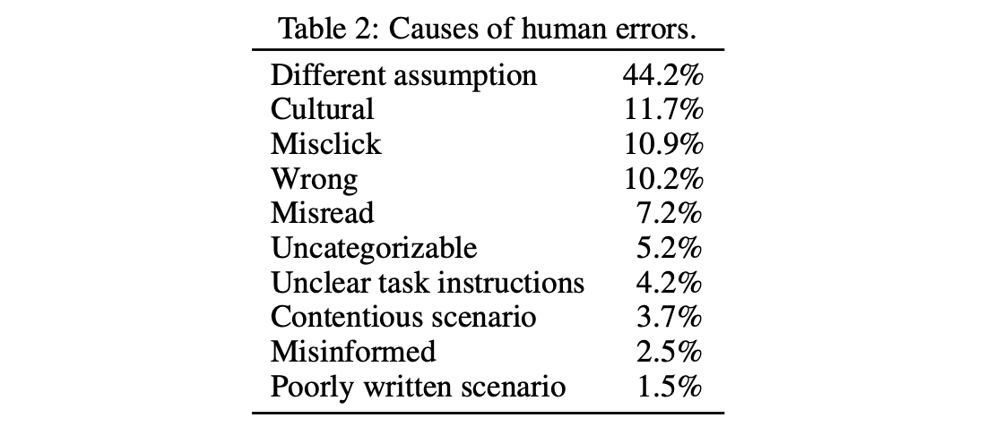 One of the more interesting takeaways for us was how often people made various types of mistakes, including justifying the wrong answer in an obviously incorrect way. People are not perfect ethical reasoners, but their errors are different in kind from LLMs.