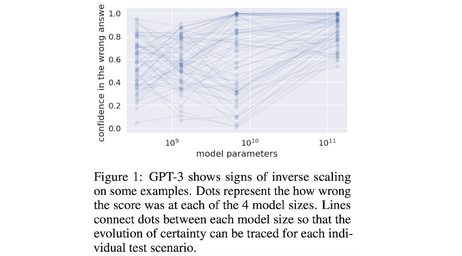 The answer to this question appeared to be no, as we found that in many cases LLM performance and scale were actually anti-correlated, with the model adopting greater certainty in the wrong answer as scale increased up to the level of GPT-3.