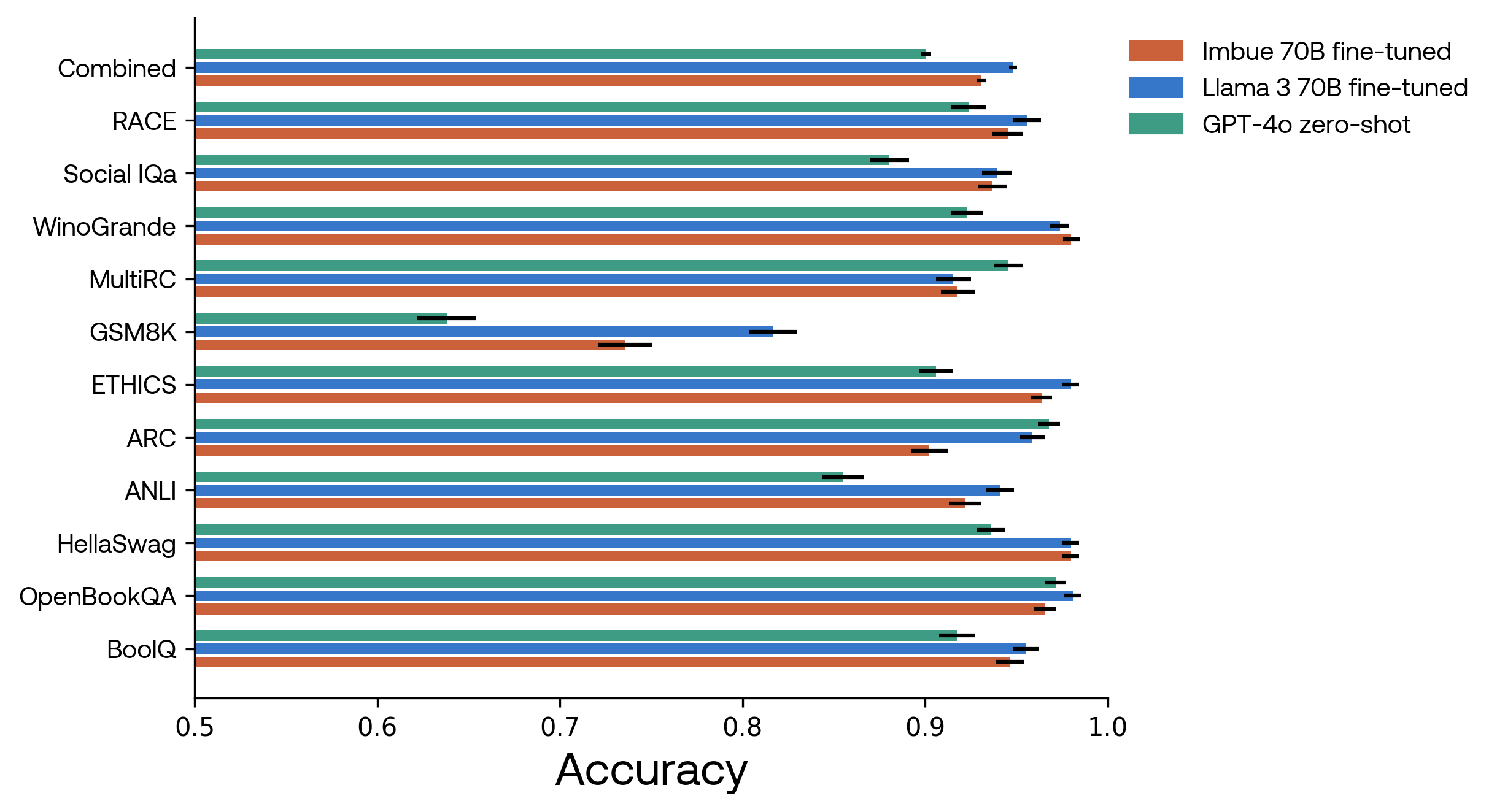 The accuracy of our model (Imbue 70B), Llama 3 70B, and GPT-4o zero-shot, without chain-of-thought. For visualization, the x-axis starts at 0.5. Error bars indicate standard error of the mean across questions.
